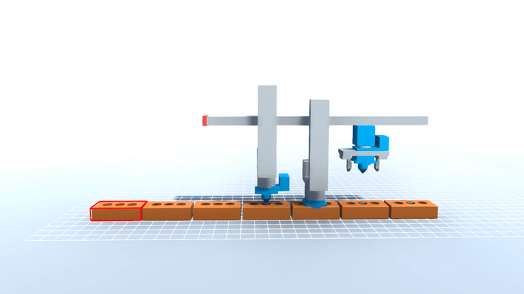 Simulation demonstrating a team of two construction robots assembling a simple wall structure.